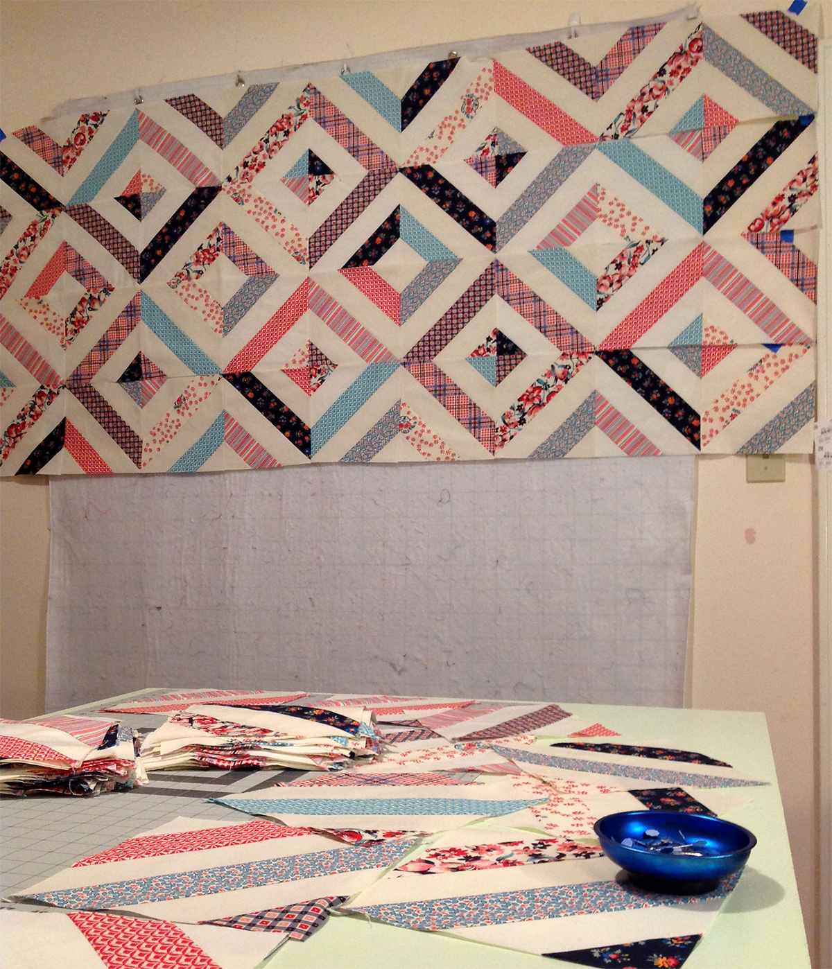 1) Whip my WIPS – I have an absurd amount of WIP’s for someone who has only been quilting for 3ish years. My goal in the next month or so is to add a section on my blog with various WIPs I plan to finish and what the status is. I’ve already started on this goal, having quilted a quilt top this past weekend that had been sitting on my shelf, pieced, for two years. Tommorow I’m turning the quilt top pictured below (I need a bigger design wall!) in to my long-armer to finish, that has also been sitting around since the last Quiltcon. I finally got the queen size top together and the back pieced last night. Those two projects are just the tip of the ice berg! (Linking up to Freshly Pieced for WIP Wednesday!)
